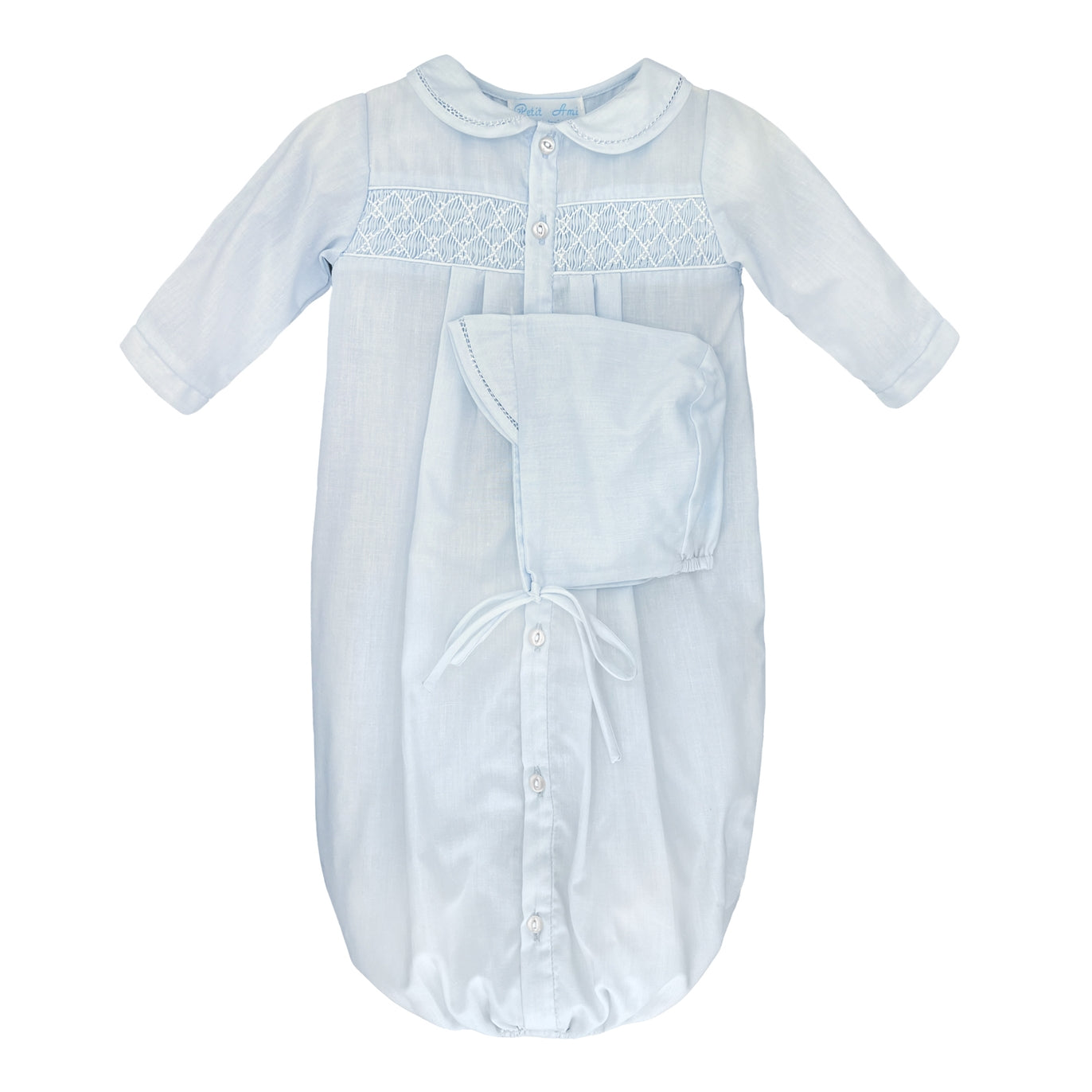 Petit Ami Blue Neutral Smocked Bag and Bonnet