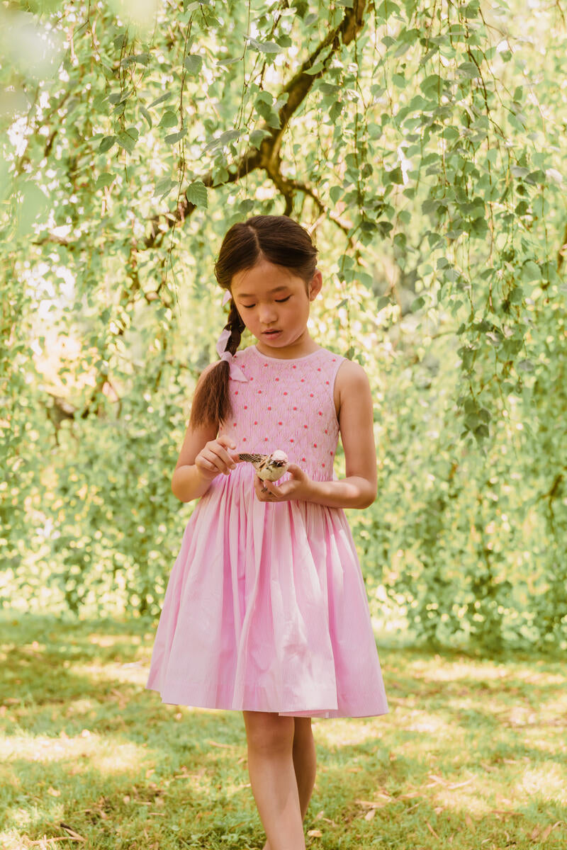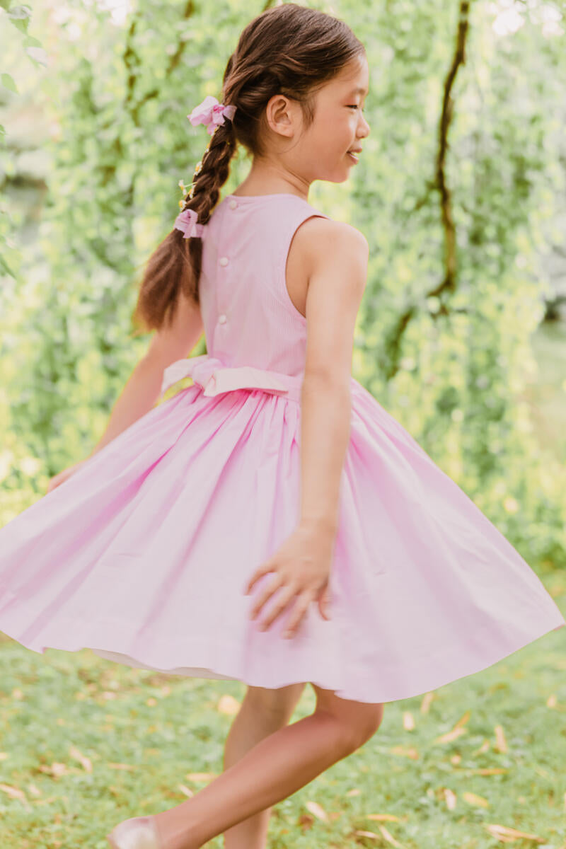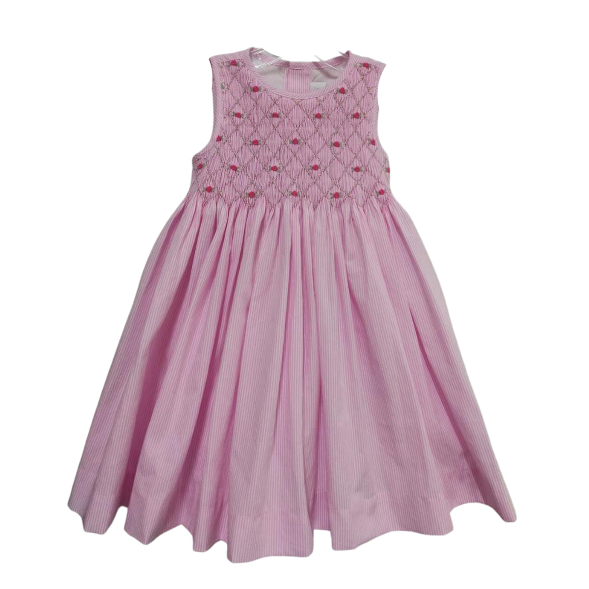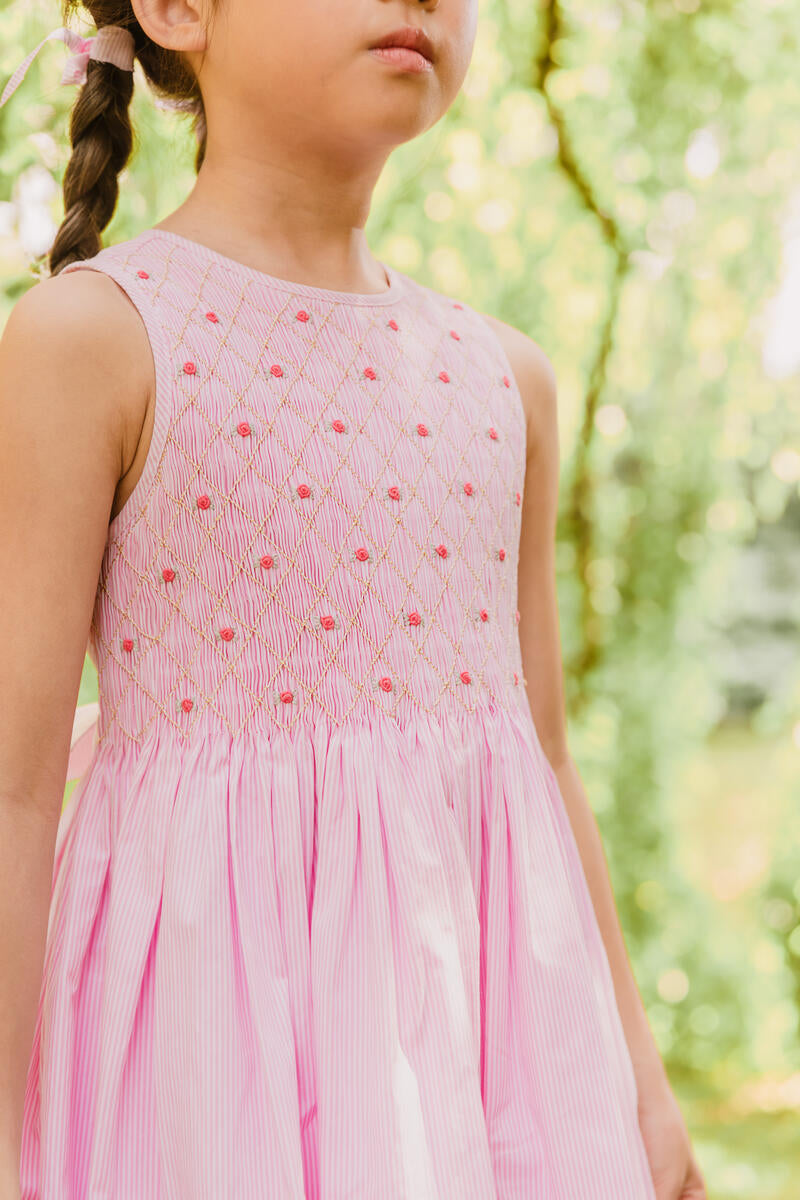 - Sleeveless pink stripe hand smocked dress (variant available in blue)