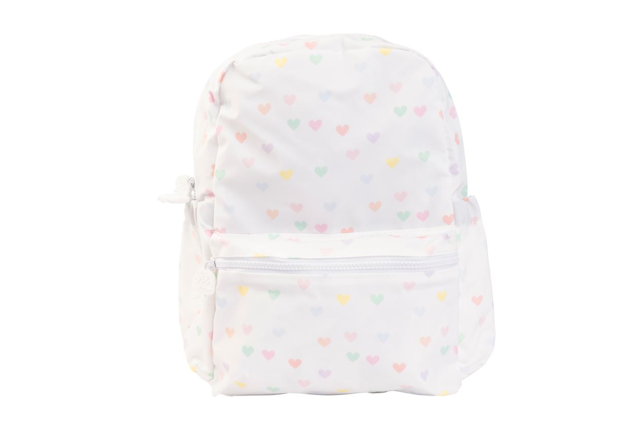 Available in three sizes. The tot is just right for the young toddler that carries his or her own bag. The small fits a pocket folder. And the large is your standard sized backpack for older kids or when you need to carry a little more.