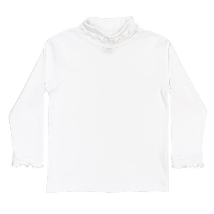 Perfect on its own or layered under dresses, this long sleeve cotton blouse features a mock turtleneck lined with micro ruffles, with additional ruffles on the sleeves for extra sweetness.
