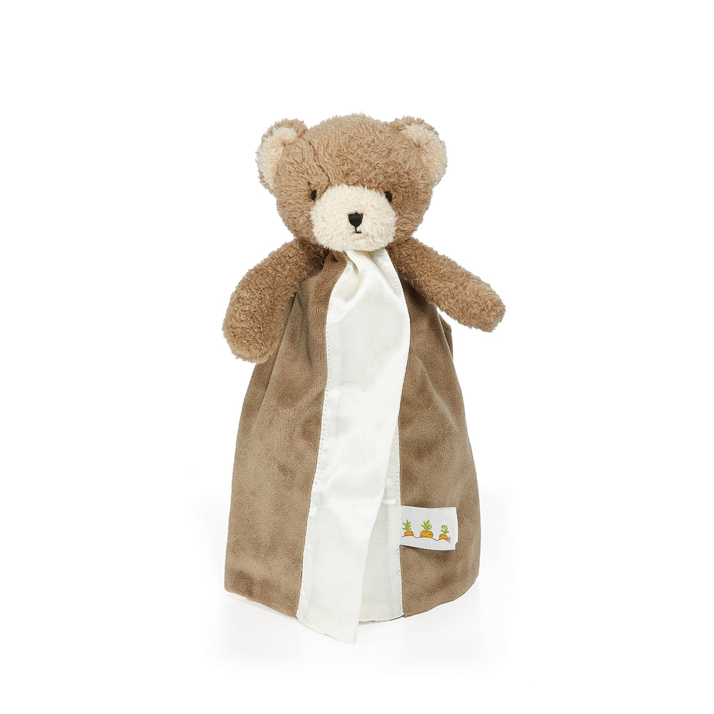 Cuddly bear Cubby comes in mushroom brown and warm cream plush fur.  Handcrafted, baby-safe embroidered face and a snuggly soft mushroom brown velour split blanket lined and edged in silky soft cream satin.  A smaller version of our best-loved Buddy Blanket, this Lovey is ready to be on the go. With a handy loop on the back to attach to the car seat, stroller or crib you're sure to never be left without this precious friend again. Signature three carrot tag for little one's fingers.
