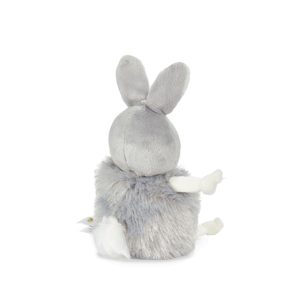 Our teeniest new friends happily fit in the tiniest hands. This is a fluffy round gray furred stuffed bunny with velour face and dangly arms and legs.  Features an embroidered face and our signature blushed cheeks.