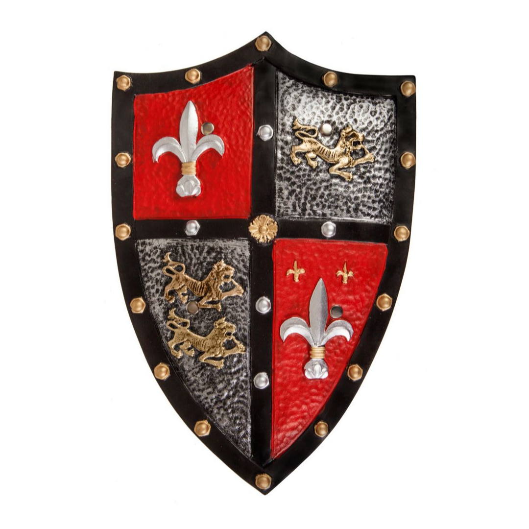 Every knight needs the perfect shield to help in warding off mystical beasts. This shield features a bold red and gold pattern with lion accents in the center, perfect for pairing with your favourite sword and suit of armor. Made from flexible textured foam and hand painted with a distressed look, this shield is oversized to defend the glory of the kingdom.