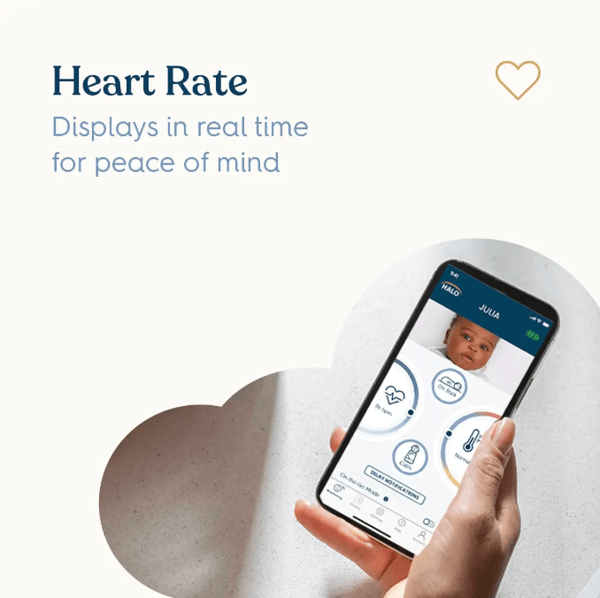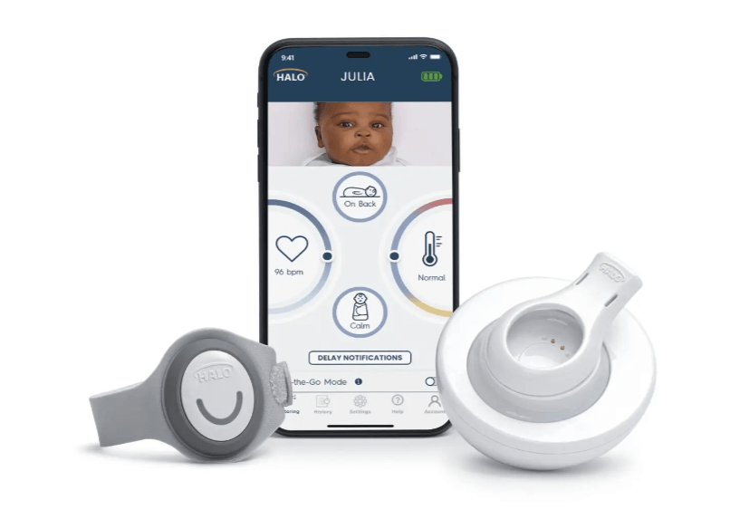 • What’s Included: Baby sensor, base station, three bands in progressive sizes, a charging cable, and adapter. The HALO app can be downloaded for free