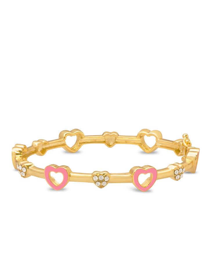 This adorable bangle bracelet for girls features open hearts in hand-painted enamel and crystals, with 18K gold plating and a high-polish finish. Hinged opening and closure.