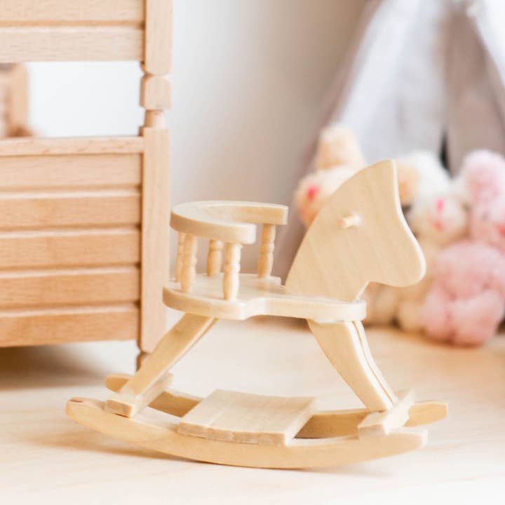 The perfect toy for your dollhouse nursery to bring a nostalgic vibe to life. It's a miniature equine delight that brings timeless charm and playfulness to your dollhouse nursery or playroom!