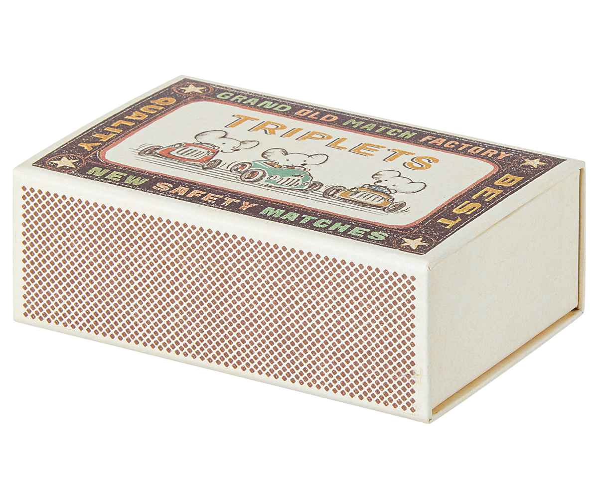 Surprise! It's triplets! Not two, but three baby mice in a box! They cosy up together in their box to sleep and keep their mummy on her toes during the day. Dressed in complementary stripes, they come cuddled together in blanketed pockets.