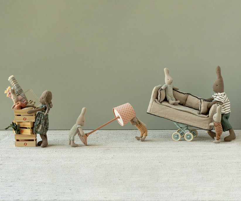 The beautiful Maileg miniature floor lamp is a must-have. The lamp will light up the room with a soft tone - remember to turn off the light when the friends go to bed. The battery can be changed by an adult.