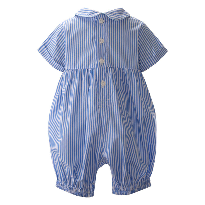 New! Introduce your little one in style with our Nutcracker March Smocked Babysuit! This adorable romper features a blue and ivory striped pattern, with a beautifully smocked panel and festive nutcracker embroidery. The peter pan collar, the short turn-up sleeves and short legs with blue piping add a charming touch. With a gathered bottom for a puffed effect, and button closures at the back and inner leg for easy changes, this suit is perfect for strolls with the family.