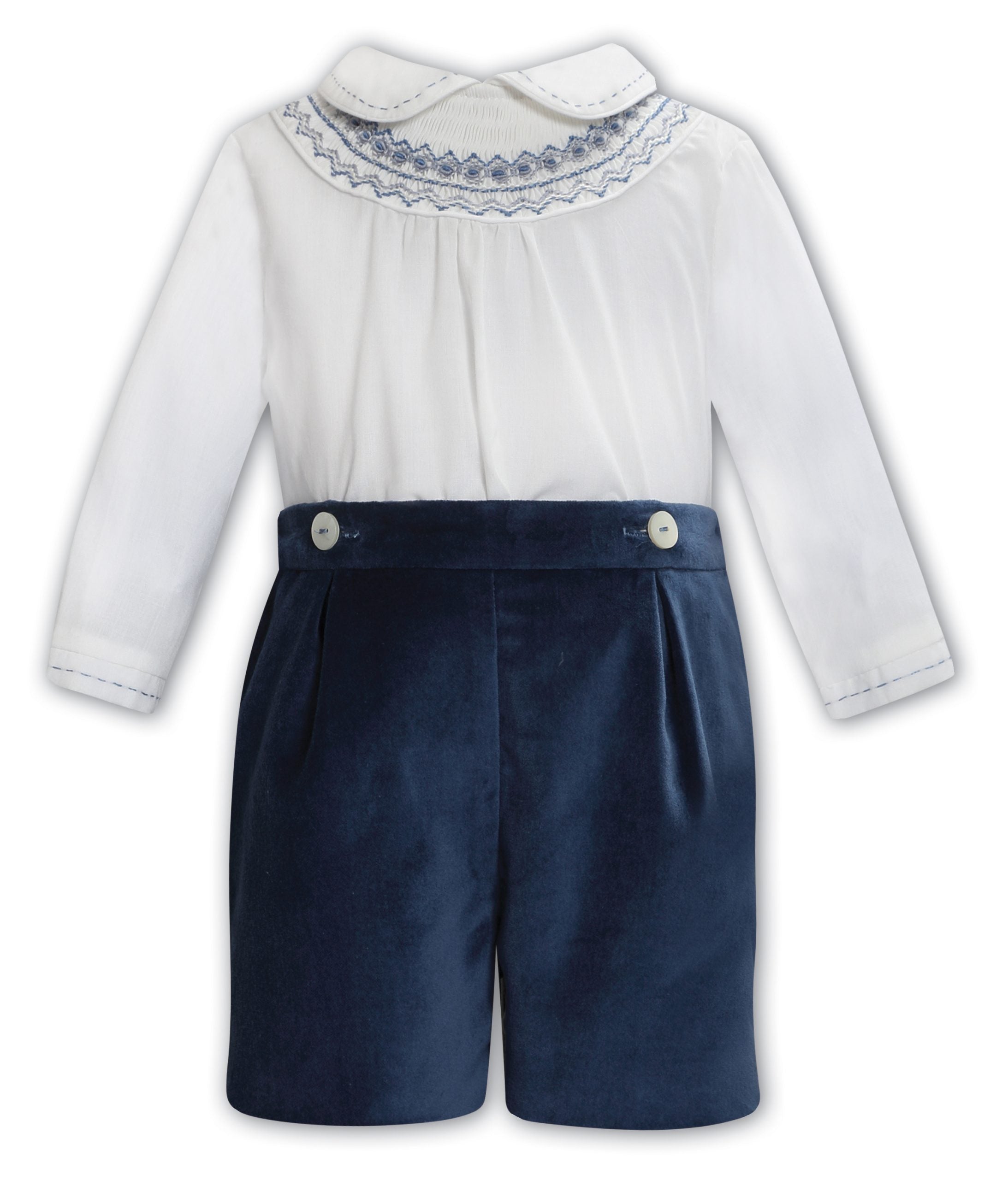 Fit for a prince! Our charming 2-Piece boys’ set is the perfect ensemble for any special occasion. This elegant outfit features soft velvet shorts, buttoned at the waist for a secure fit. The set is completed with an ivory hand-smocked shirt, adorned with a classic Peter Pan collar. Make your little one shine in this sophisticated and stylish attire.